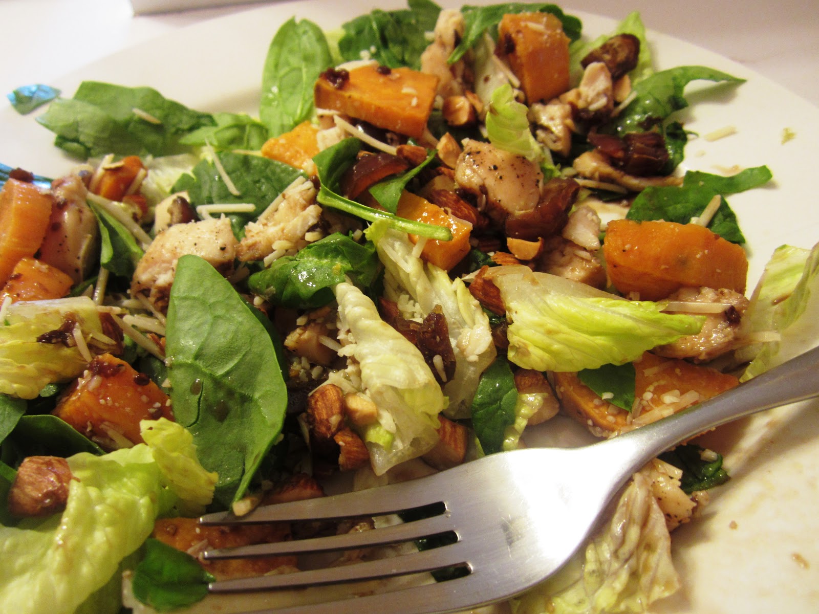 | Here is mommy's: spinach and romaine, roasted sweet potatoes, roasted chicken, shredded Parmesan, chopped dates, almonds, and teriyaki balsamic vinaigrette. It was UNBELIEVABLE! |